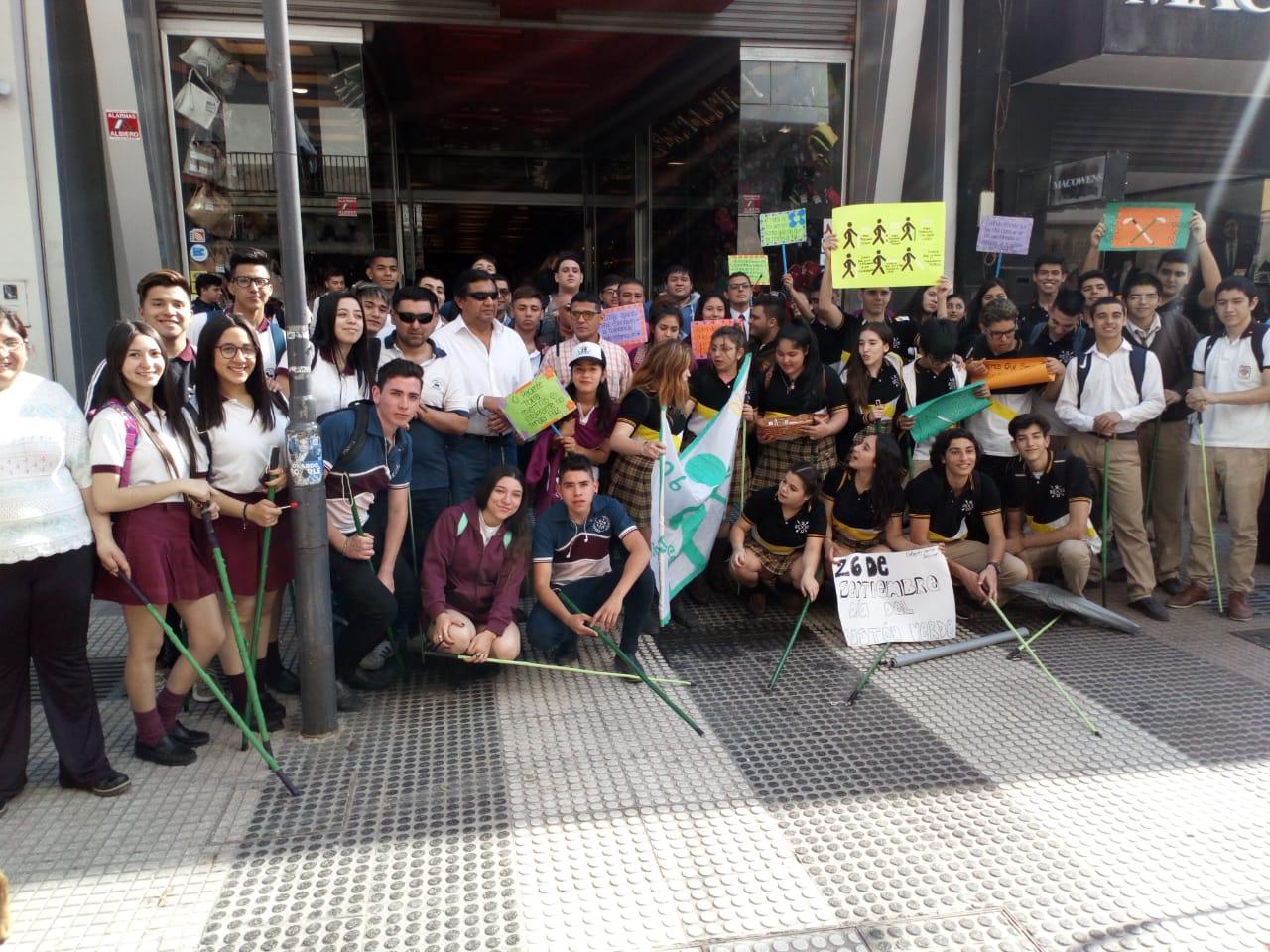 Alrededor de 45 personas con baja visibilidad están marchando desde la peatonal Mendoza hasta la plaza Independencia con sus bastones verdes para luchar contra el prejuicio y la discriminación. También los chicos de la Escuela Benjamín Matienzo y el Colegio Santo Domingo se sumaron con carteles y panfletos a la actividad mientras algunos transeúntes se detienen para escucharlos y entenderlos.