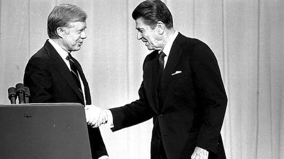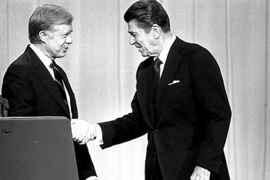 El debate entre el presidente demócrata Jimmy Carter y el retador republicano Ronald Reagan desembocaron en el poco frecuente caso de que un presidente de EEUU no consiga la reelección. Carter prometió un relanzamiento económico (había crisis y la inflación alcanzaba al 10% anual), reivindicó el tratado de no proliferación nuclear suscrito con la URSS el año anterior y acusó de “belicista” a su contendiente. Pero llegaba muy desgastado por la “crisis de los rehenes” estadounidenses durante la revolución islámica en Irán. Reagan, precisamente, cuestionó con severidad la gestión del demócrata. Las críticas se resumieron en una pregunta: “¿Estamos mejor que hace cuatro años?”. Habían llegado parejos en las encuestas. La balanza se inclinó para el republicano, en su tercer intento por alcanzar la máxima magistratura de su país.