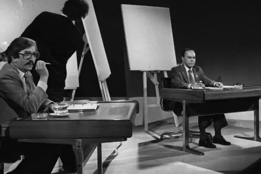 El primer antecedente de un debate electoral televisado en la Argentina data de 1984, un año después del retorno de la democracia, durante la presidencia de Raúl Alfonsín. No fue un debate presidencial, pero sí se realizó a propósito de unos comicios: el líder radical había convocado a un plebiscito, no vinculante, por el conflicto con Chile respecto del Canal de Beagle. La consulta a la ciudadanía era si se aceptaba o se rechazada el Tratado de Paz y Amistad con el país vecino. Quienes confrontaron ideas aquella vez fueron el canciller Dante Caputo, defensor del “Sí”; y el el senador peronista Vicente Leonidas Saadi, impulsor del “No”. El debate fue moderado por el periodista Bernando Neustadt. “El debate se caracterizó por el tono contrastante de ambas exposiciones”, dice la nota de LA GACETA del viernes 16 de noviembre de 1984, que cronica el encuentro del día anterior. “Mientras la moderación y la detallada explicación caracterizaron las intervenciones del canciller, Saadi dio a las suyas un tono enfervorizado, de tribuna política”, consigna la tapa del diario. Agrega que otro elemento contrastante fue que Saadi “leyó casi constantemente, a diferencia de Caputo”. “Basta de cháchara” y “No se vaya por las nubes de Úbeda”, fueron dos latiguillos de Saadi que quedaron inmortalizados.