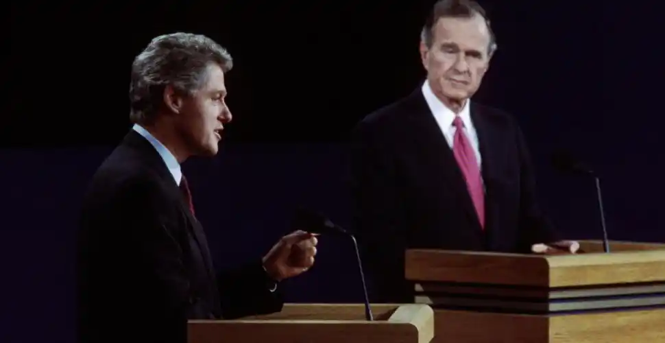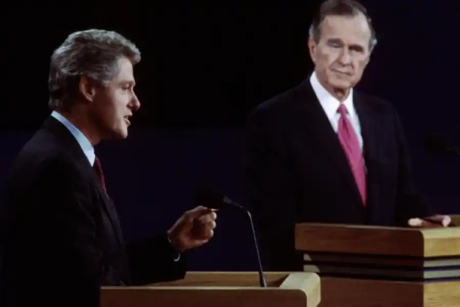 En 1992, George H. W. Bush (mejor como Bush “padre” a partir de que su hijo homónimo sería también presidente de EEUU entre 2001 y 2009) buscó infructuosamente su relección: perdió los comicios contra el demócrata Bill Clinton, entonces gobernador de Arkansas. En octubre de ese año se realizó el primero de los debates presidenciales, del cual también participó el candidato independiente Ross Perot. La crónica del diario El País, de España, rescata una encuesta de la televisora estadounidense ABC en la que los televidentes daban como ganadores a Clinton (28) y a Perot (24%, pese a que iba por fuera de los grandes partidos de ese país), mientras que al entonces mandatario le asignaban un perdidoso 18%. “Lo más dramático para él es que estuvo bien (dice la crónica). Se mantuvo con dignidad ante los ataques de sus rivales y supo sacar a la palestra su carta de poseer mayor experiencia que sus rivales, pero no le funcionó. Bastaba una broma de Perot, o una mirada de Clinton a la cámara prometiendo un nuevo horizonte, para que todo el trabajo de Bush quedara en un segundo plano”. Bush (padre) había formalizado los acuerdos que pusieron fin a la guerra fría y había ganado la “Guerra del Golfo”, derrotando a Irak, que había invadido a Kuwait. Pero la crisis económica le costó la carrera política.