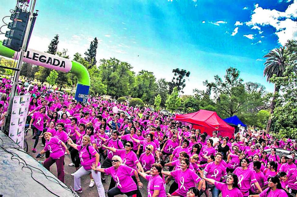 TODAS DE ROSA. Las tucumanas que participaron en la maratón que organizó Matsa hacen un precalentamiento antes de empezar la carrera.