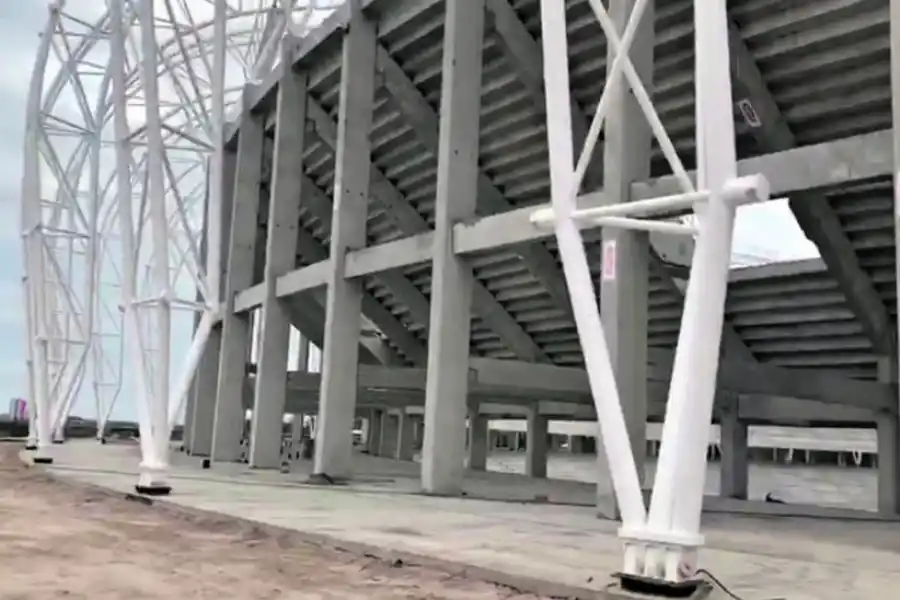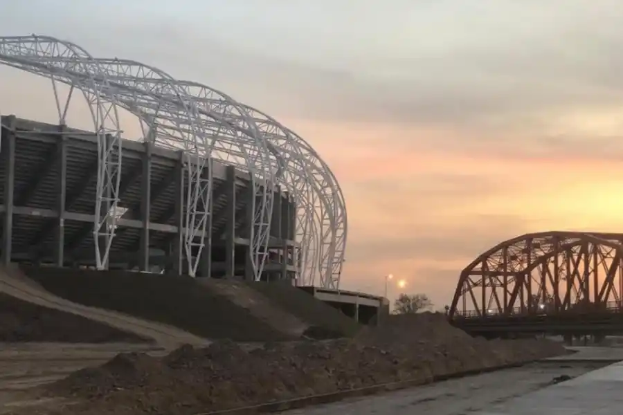 La gran obra se encuentra a la vera del río Dulce, entre el Jardín Botánico y el Puente Carretero. Más de 300 personas trabajan diariamente para cumplir con los términos establecidos, por eso no sorprende el gran despliegue de maquinarias. “Ya está prácticamente terminada toda la obra de hormigón. Faltan solamente detalles de terminación. También finalizamos con el 100% de la estructura metálica de lo que será la cobertura. Actualmente se están complementando los ajustes de las pasarelas técnicas. El estadio tiene una particularidad: los cierres laterales forman parte de la cubierta. Es como si fuese una mandarina”, reveló D’Angelo.