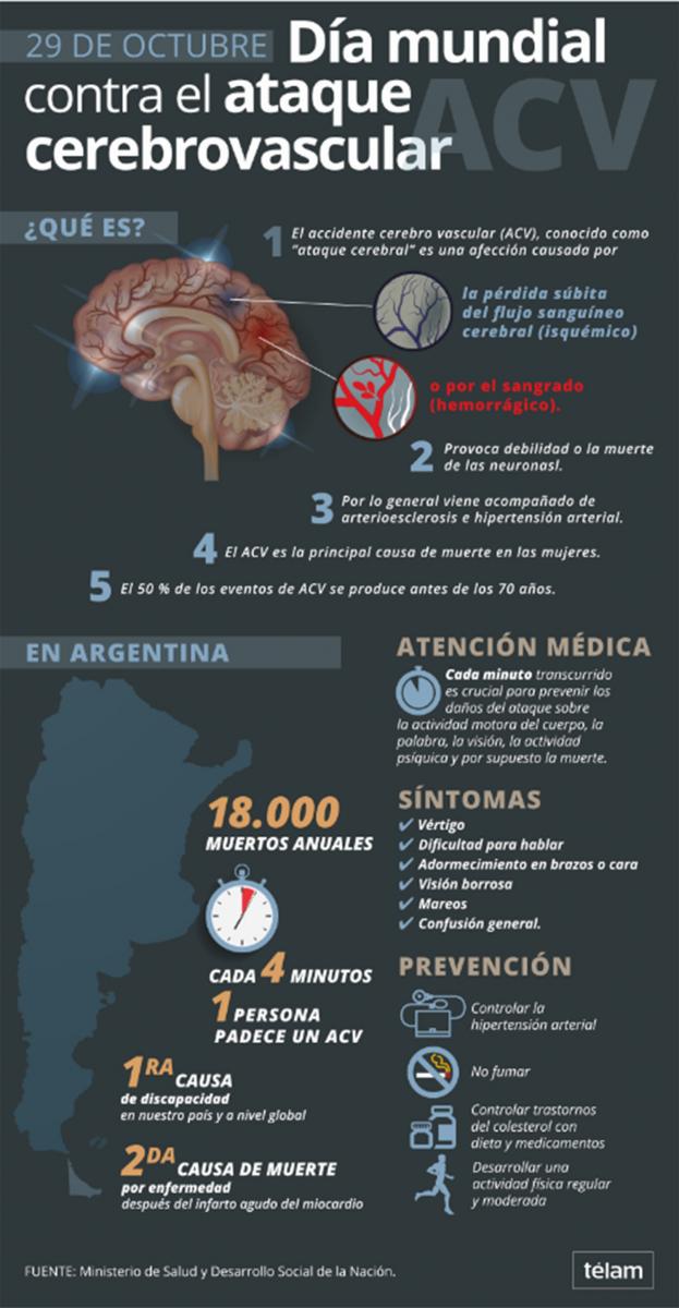 Se calcula que cada 4 minutos una persona sufre un ACV en Argentina, y que se producen 18.000 muertes anuales, a pesar de que casi el 90% del riesgo está dado por factores tratables: hipertensión, hipercolesterolemia, diabetes, tabaco, alcohol y sedentarismo.