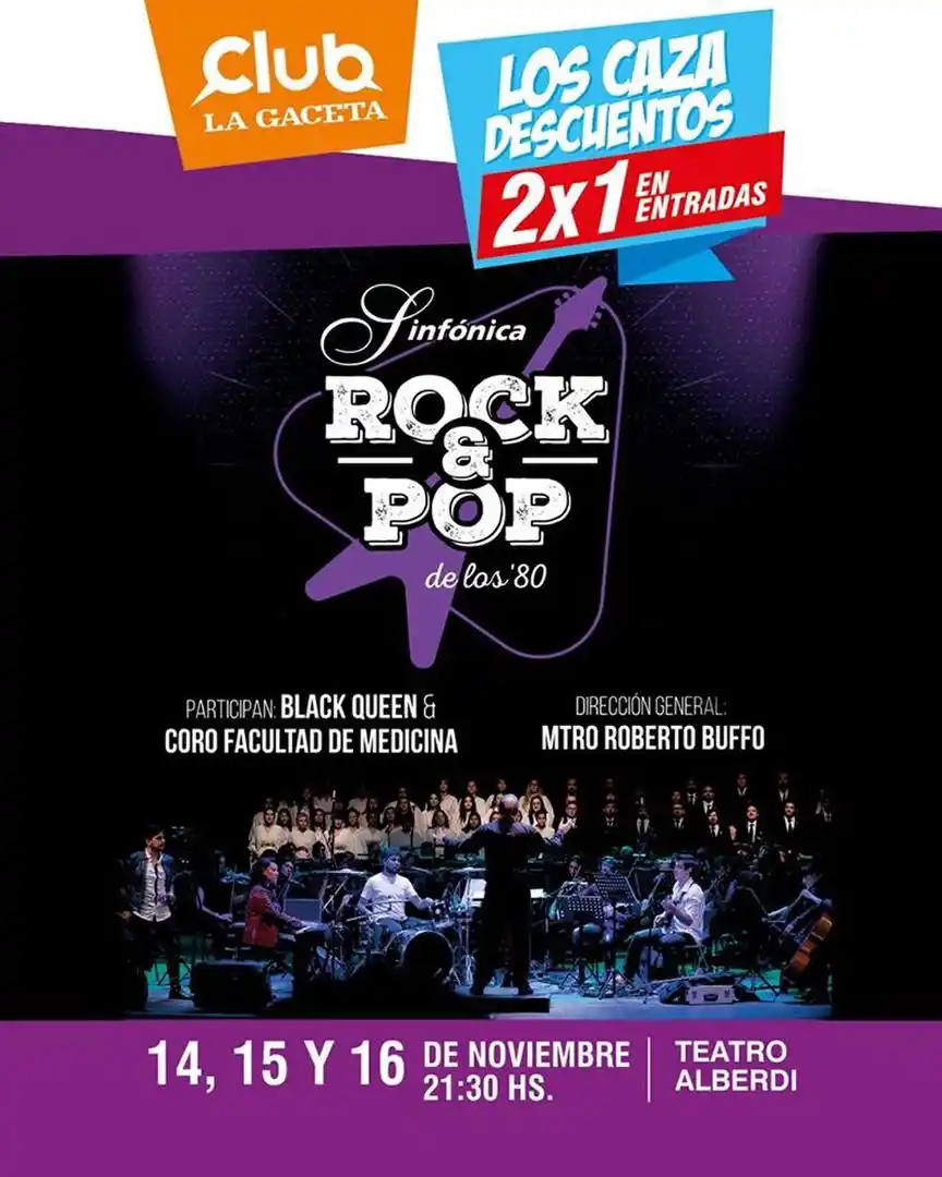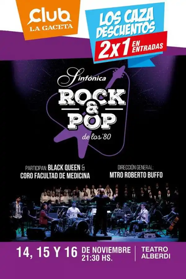 Hoy y mañana, a las 21.30, en el teatro Alberdi, la Orquesta Sinfónica de la UNT, dirigida por Roberto Buffo, propone revivir el “Rock y Pop de los 80” en un show multimedial con 22 temas de 22 bandas e íconos mundiales. Participan la banda Black Queen, Ashley Mattheus y Juan Martínez Romero como solistas invitados, así como el Coro de la Facultad de Medicina, que dirige Mariana Stambole.