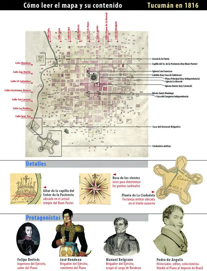 Grandes y hermosas letras caligrafiadas dominan la parte superior. Abajo, unas cuatro cartelas contienen otros tantos párrafos. En el medio, el dibujo describe sólo la planta de los edificios construidos. De una simple mirada se deduce que la ciudad de Tucumán, en la segunda década del XIX, eran unas pocas manzanas, un grupo pequeño de casas. Las pocas anotaciones que se integran al dibujo, nombran la plaza, las iglesias, el Corral de la Patria y el santuario del Señor de la Paciencia, hoy iglesia del Buen Pastor.