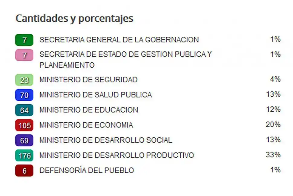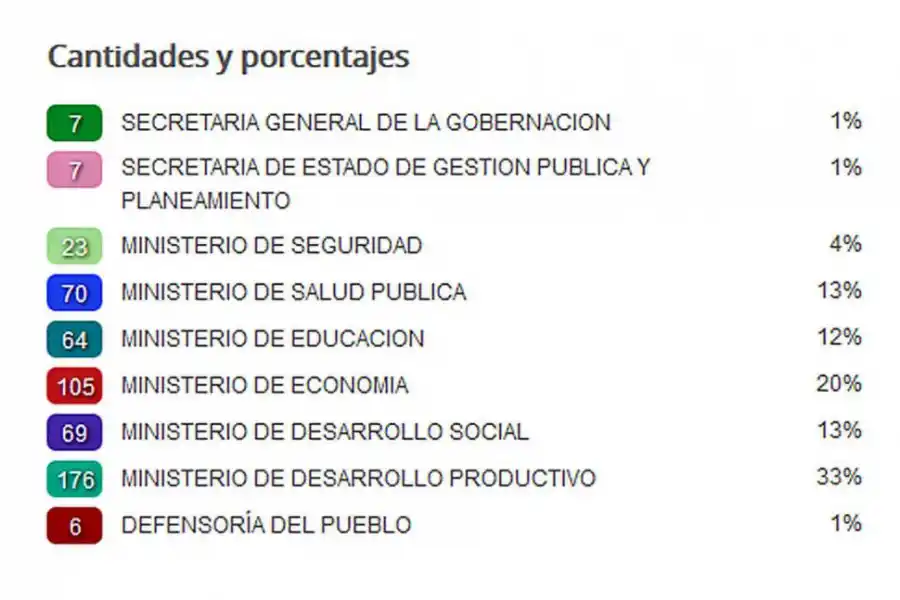 En esta página del PE, que fue actualizada ayer, se puede observar que el área de Gobierno que más iniciativas presentó fue el Ministerio de Desarrollo Productivo, con 176, o sea un 33% del total. En el final de la escala aparecen las secretarías General de la Gobernación y de Planeamiento, y la Defensoría del Pueblo (ver recuadros).