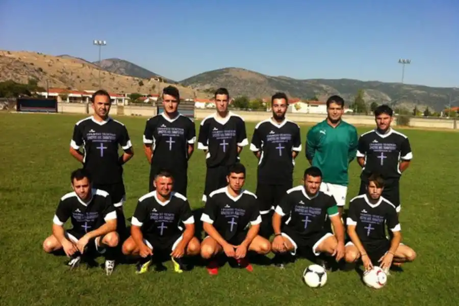 No fue el único caso curioso de Grecia. Con el mismo objetivo de sortear la crisis económica, Paliopyrgos llegó al punto de negociar con una funeraria. En una camiseta negra, lucía una cruz blanca con la leyenda “Funeraria Karaiskaki 53”. Muy macabro.