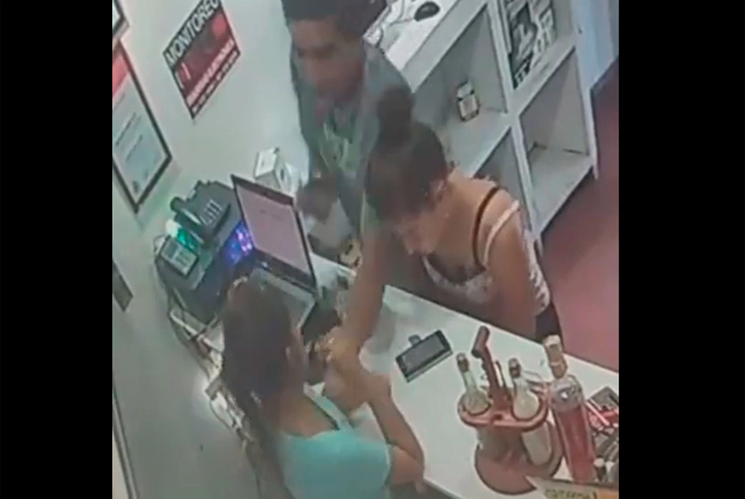 En las imágenes se ve cuando entra una joven y le muestra un celular a la empleada que está detrás del mostrador, aparentemente pidiendo que lo reparen. Momentos después ingresa su cómplice, que se hace el distraído y luego saca un arma de fuego.