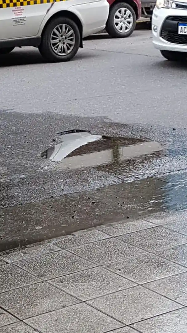 Pérdida de agua y pavimento hundido en calle Laprida al 500