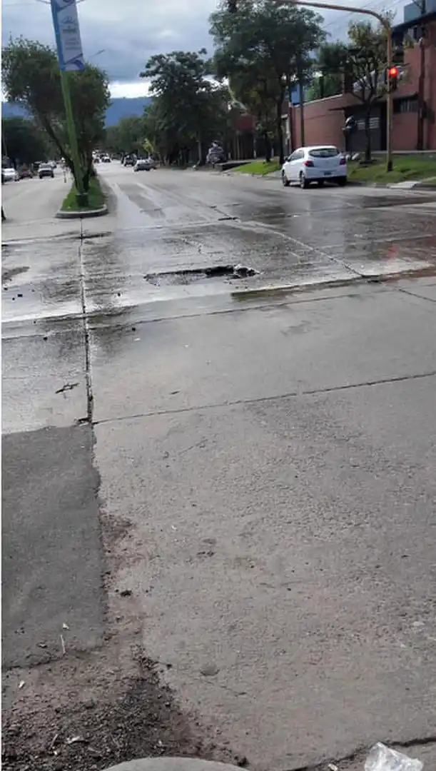 El bache aparecen de golpe para muchos conductores. Se encuentra en la esquina de avenida Belgrano y Godoy Cruz. En el caso de los automovilistas quizá no signifique más que un golpe en una rueda o en la dirección de sus autos, pero en el de los motociclistas pueden significar una caída y hasta una tragedia.