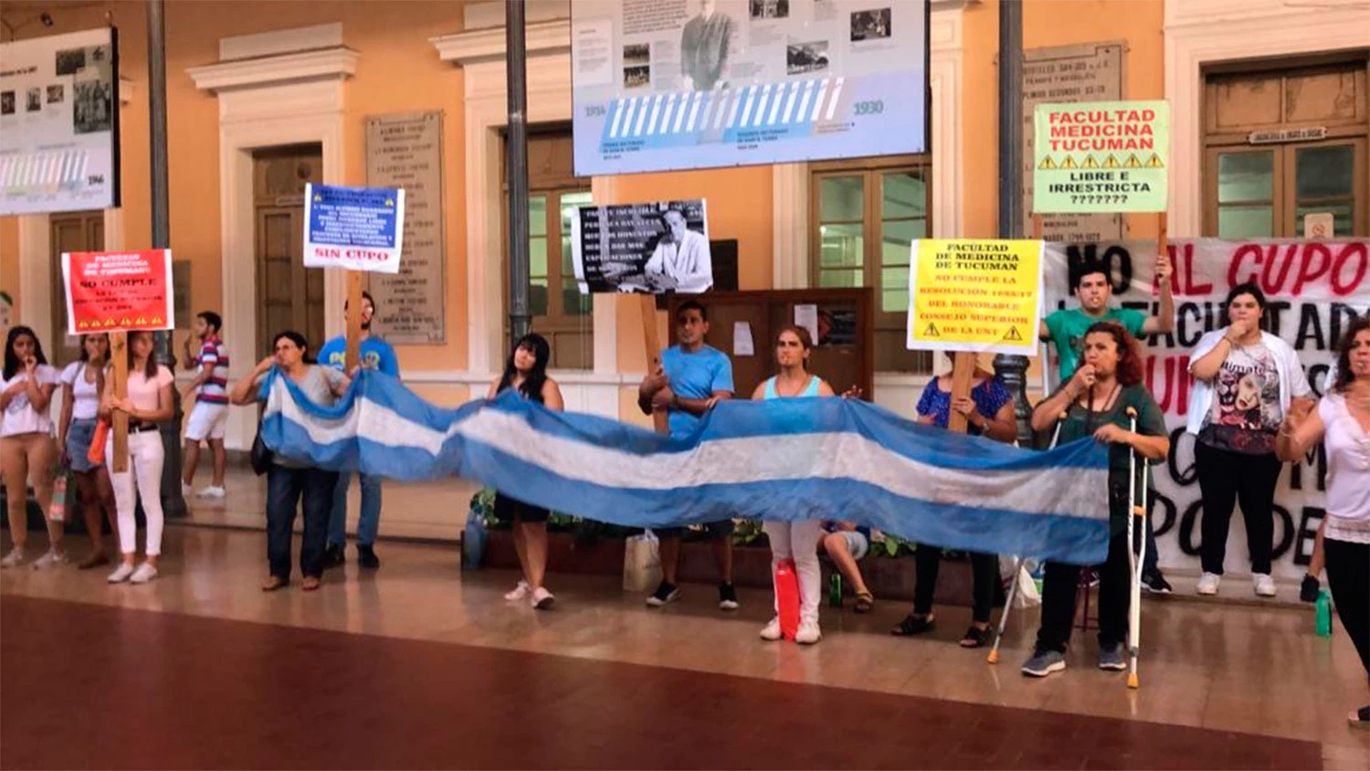 Mientras se desarrolla el encuentro, un grupo de padres y alumnos realizan una protesta en el mismo edificio. Según sostienen, es ilegal el cupo de ingreso que tiene hace 30 años la Facultad de Medicina de la UNT.