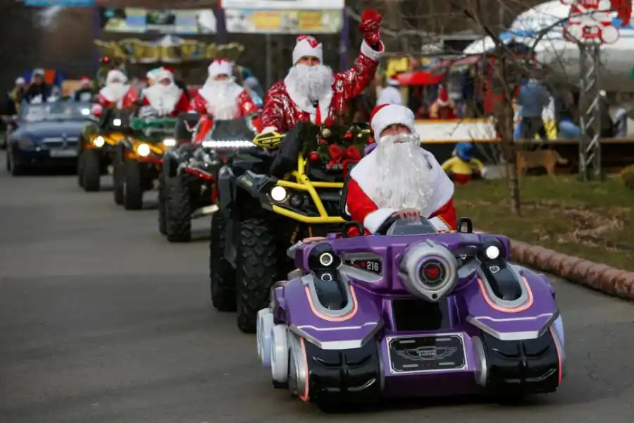 Y en Stavropol, Rusia, del otro lado del mundo, unos conductores de cuatriciclos con disfraces del equivalente ruso de Papá Noel, Ded Moroz, participan en un desfile.