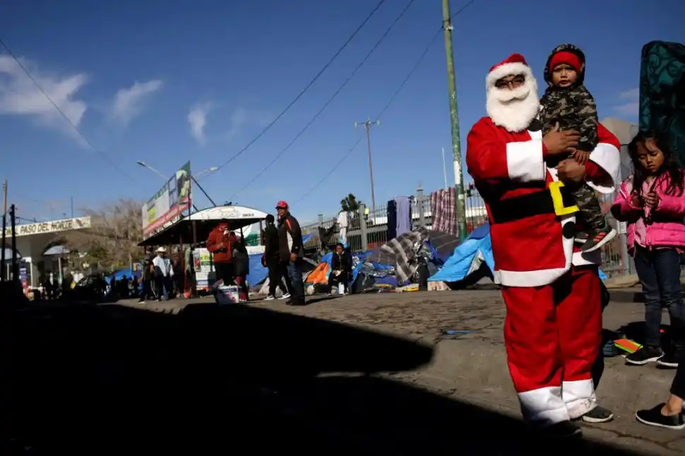 Mientras tanto, un hombre vestido como Papá Noel lleva en sus brazos a un niño migrante que acampaba junto a sus padres cerca del puente de Paso del Norte, en la frontera entre México y Estados Unidos. El pequeño y su familia les solicitaron asilo a las autoridades norteamericanas poco antes de la celebración de Navidad (foto del centro).