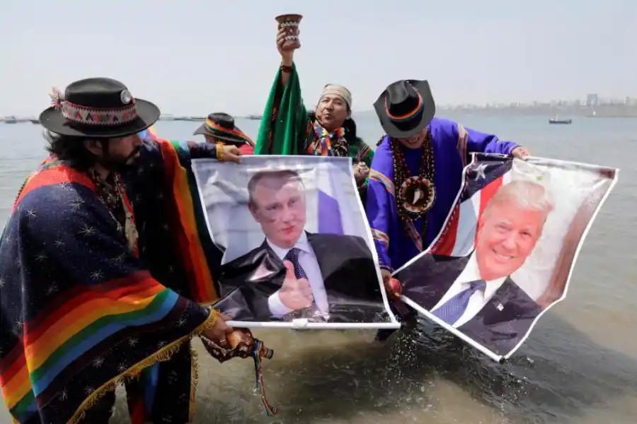 En la playa de Los Pescadores, Chorrillos, Lima, chamanes peruanos sostienen posters de Putin y de Trump durante un ritual de predicciones sobre cómo será el próximo año.