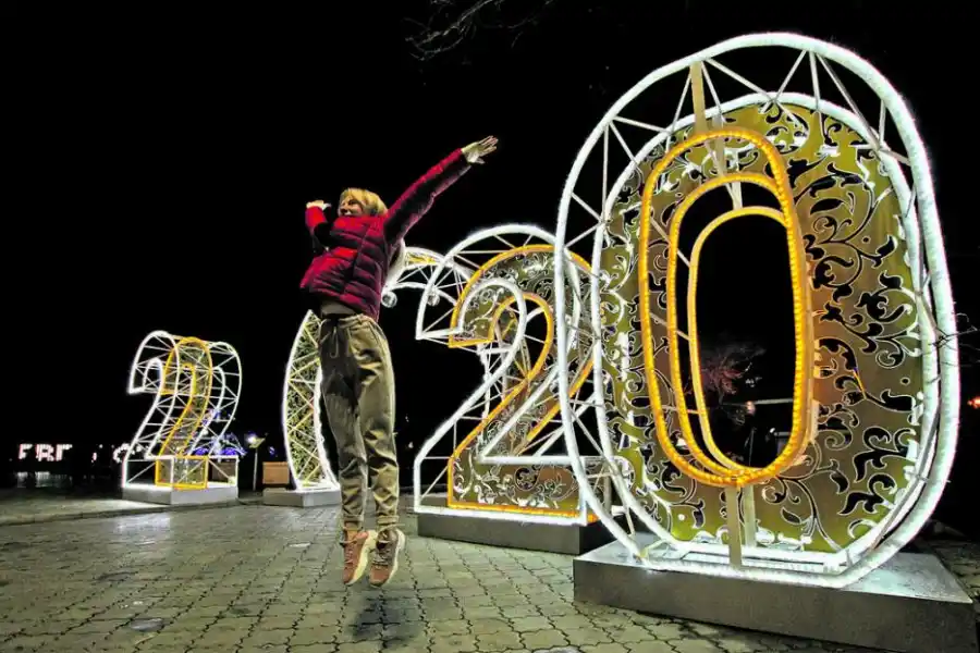 Los enormes números que dan forma al 2020, hechos de hierro y luces, son la gran atracción de la ciudad de Yevpatoriya, y allí posan tanto los turistas como la gente del lugar.