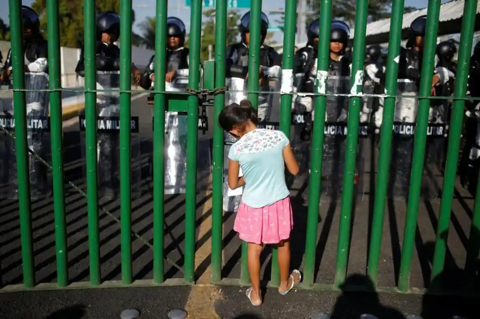 Una nueva columna masiva de migrantes se instaló en la frontera entre Guatemala y México. Quieren llegar hasta Estados Unidos, pero el Gobierno mexicano pretende frenarlos para cumplir sus acuerdos con Donald Trump. En la imagen, una niña observa a los policías mexicanos que, armados con cascos y escudos, tienen la misión de evitar el avance de a columna. Ella parece no tenerles miedo.