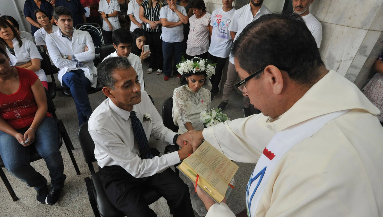 El capellán de la Maternidad, Enzo Romero, quien los conoce desde que Lidia ingresó al hospital hace un año, fue el encargado de oficiar la unión de los enamorados. “Vinimos acompañando todo sin forzar nada. Voluntariamente quisieron celebrar el casamiento y nosotros le hemos allanado el camino. Pedimos autorización al arzobispado y así pudimos hacer la celebración acá”, comentó el sacerdote.