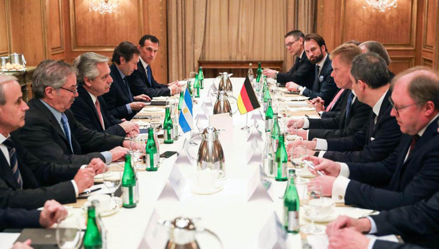 El mandatario está acompañado en la mesa por el canciller Felipe Solá, el embajador de Argentina ante Alemania, Pedro Villagra Delgado; el secretario de Asuntos Estratégicos, Gustavo Béliz; el secretario general de la Presidencia, Julio Vitovello; y el jefe de gabinete de Cancillería, Guillermo Justo Chaves.