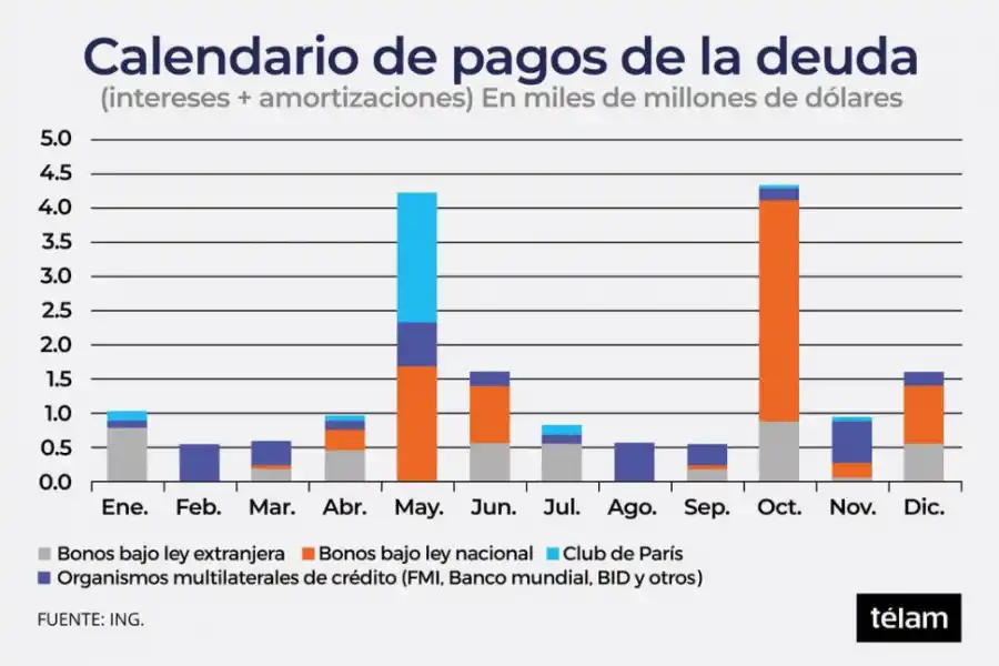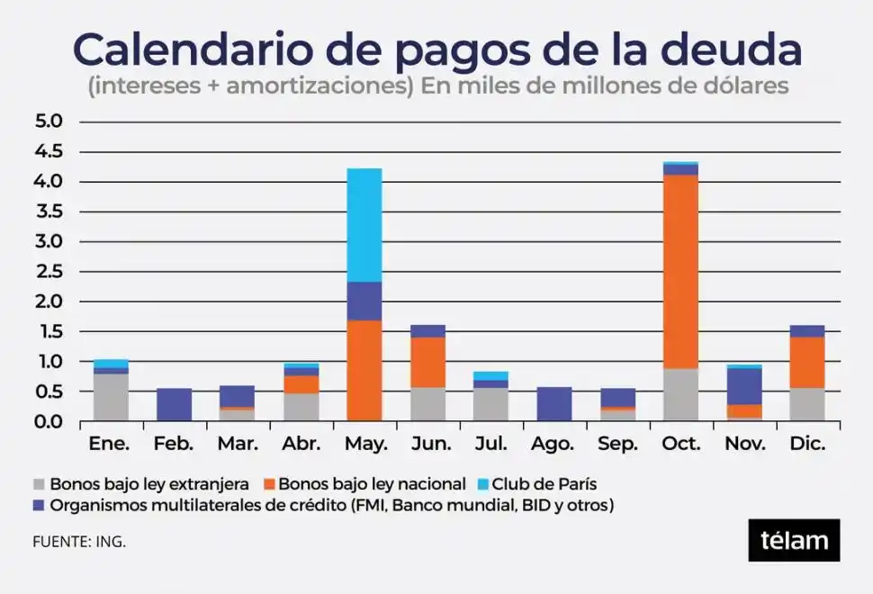 Este año hay otros U$S 4.200 millones con organismos como el FMI. Además, alrededor de U$S 7.200 millones de deuda que vencen este año se encuentran bajo la ley local, situación que le otorga al Gobierno un mayor margen de maniobra para modificar condiciones.