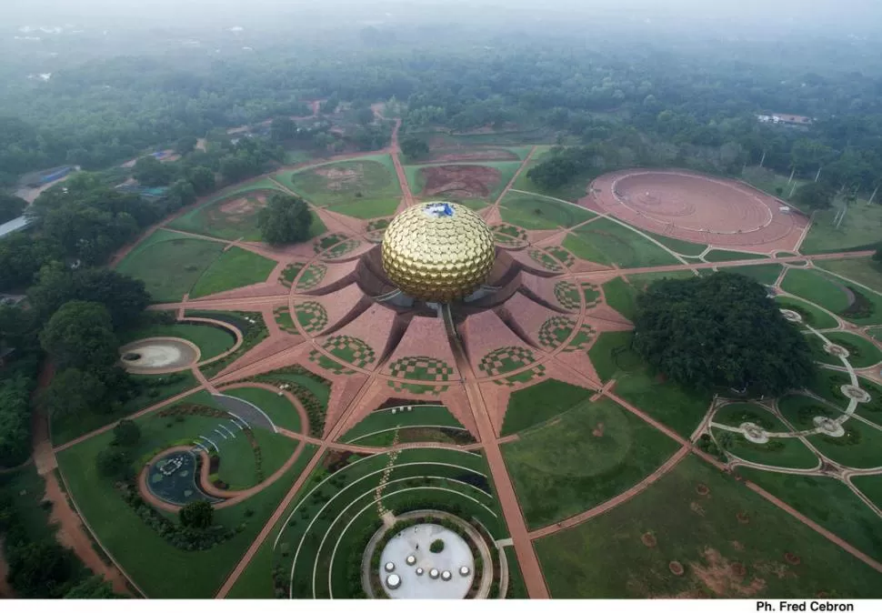 El “Matrimandir” (en sánscrito, “el Templo de la Madre”) es una gigantesca esfera dorada, misteriosa y cósmica en Auroville. Considerada el alma de la ciudad, está rodeada de un parque que por momentos parece distópico. El “Matrimandir” se asemeja a una nave espacial y su abordaje remite a un rito de iniciación.