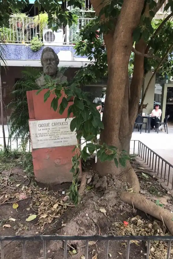 La estatua de Giosue Carducci está en precario equilibrio, empujada por las raíces del árbol del cantero, en 24 de Septiembre al 600.