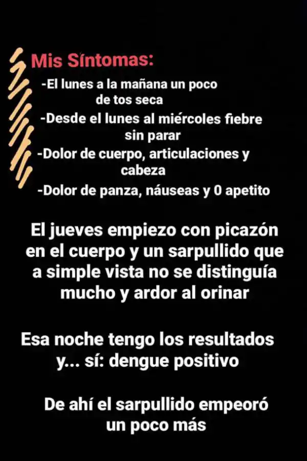 El jueves comenzó otra pesadilla para Luciana: tenía picazón en todo el cuerpo y se tocaba pequeñas ronchas sobre la piel. También tenía ardor al ir al baño. Y cero apetito. “Esa noche me llamaron para darme el resultado de los estudios. Era dengue, como yo pensaba desde el comienzo. Me dijeron que no había tratamiento posible, que debía dejar que la enfermedad pase y tomar solamente paracetamol”, cuenta. Le recomendaron no salir de su casa y ponerse repelente para que los mosquitos no la piquen y así prevenir que otras personas se puedan infectar.