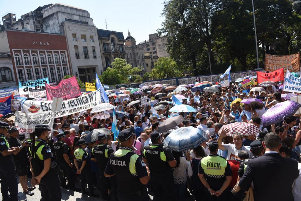 La manifestación fue encabezada por docentes autoconvocados e integrantes de Sadop. A ellos se acoplaron trabajadores de otros sectores estatales, la Asociación de Docentes e Investigadores de la UNT (Adiunt), el Frente de Gremios Estatales y Barrios y Jóvenes de Pie, entre otros. Según la Policía, las adyacencias de la plaza Independencia fueron colmadas por unas 10.000 personas.