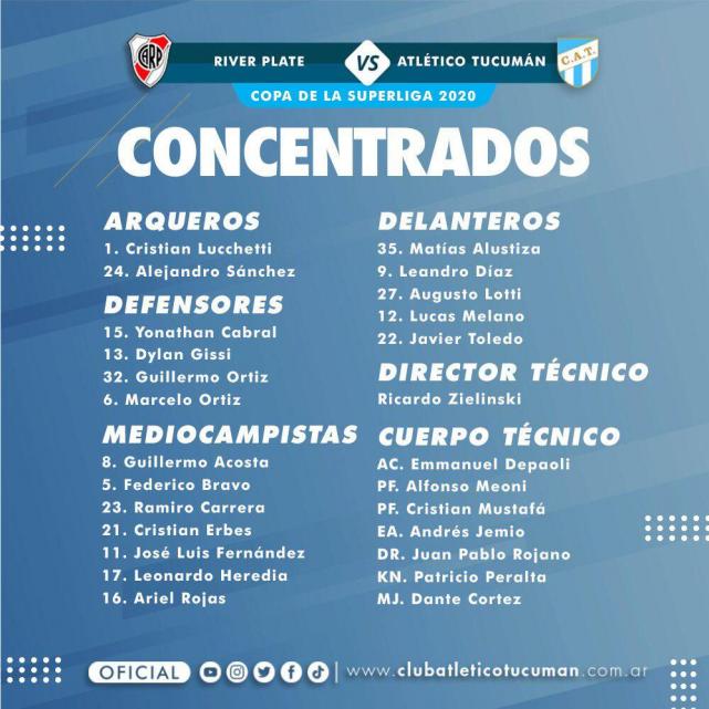 Con la única ausencia de Nicolás Aguirre, quien quedó marginado por un desgarro en el gemelo izquierdo, el entrenador de Atlético, Ricardo Zielinski, dio a conocer la nómina de futbolistas concentrados para enfrentar el sábado a River, en Núñez, en el comienzo de la Copa de la Superliga.