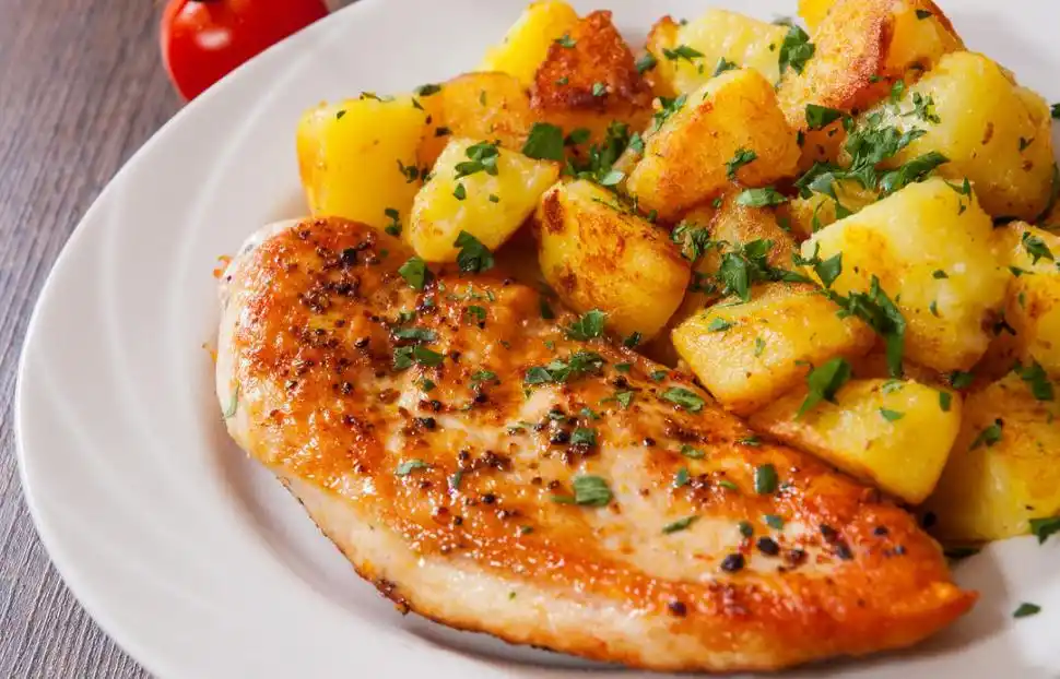 Ingredientes: 2 pechugas de pollo, 1 papa, 1 cebolla morada, 1/2 taza de romero, 2 cucharadas de manteca, 1 cucharada de vinagre de vino, una cucharada de aceite de oliva y perejil fresco.