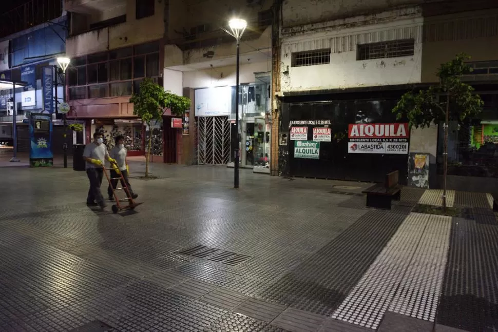 DESOLACIÓN EN LA PEATONAL. Dos operarios de una casa de comercio céntrica terminan su rutina antes de que se inicie el aislamiento social. la gaceta / foto de diego araoz