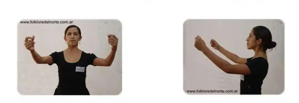 Comenzaremos haciendo la postura inicial de los brazos que necesitamos para bailar. La posición correcta de éstos consiste en levantar las manos naturalmente a la altura de los ojos, con los codos en arco (NO en ángulo) y las palmas de las manos mirándose entre sí. Esta posición es para bailar folclore de forma tradicional.