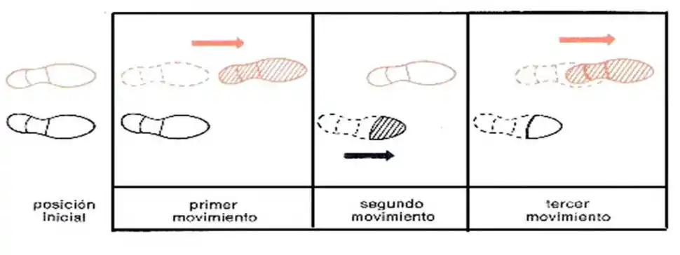 Ahora, aprenderemos a hacer el Paso básico de baile, que es el empleado en la mayoría de las danzas. El Paso básico tiene tres movimientos de avance, con desplazamiento en el primero y en tercero. Estos tres movimientos entrarán en un compás musical. Cuando se acaba la serie con un pie, se repiten todos los movimientos con el otro.