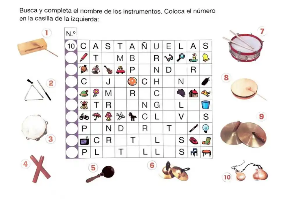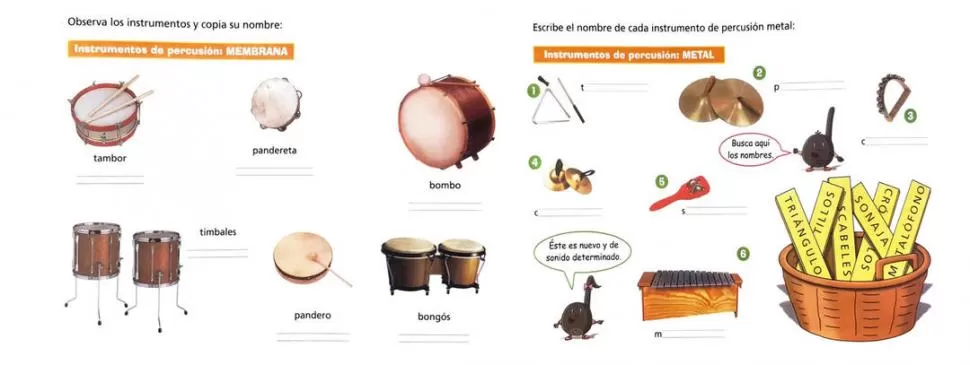 Hoy llego a tu casa con una caja de música, llena de instrumentos musicales de percusión. Hay algunos de membrana y otros de metal, para formar una banda. Como tenemos que llamarlos por sus nombres, vamos a completar esta actividad para conocerlos.