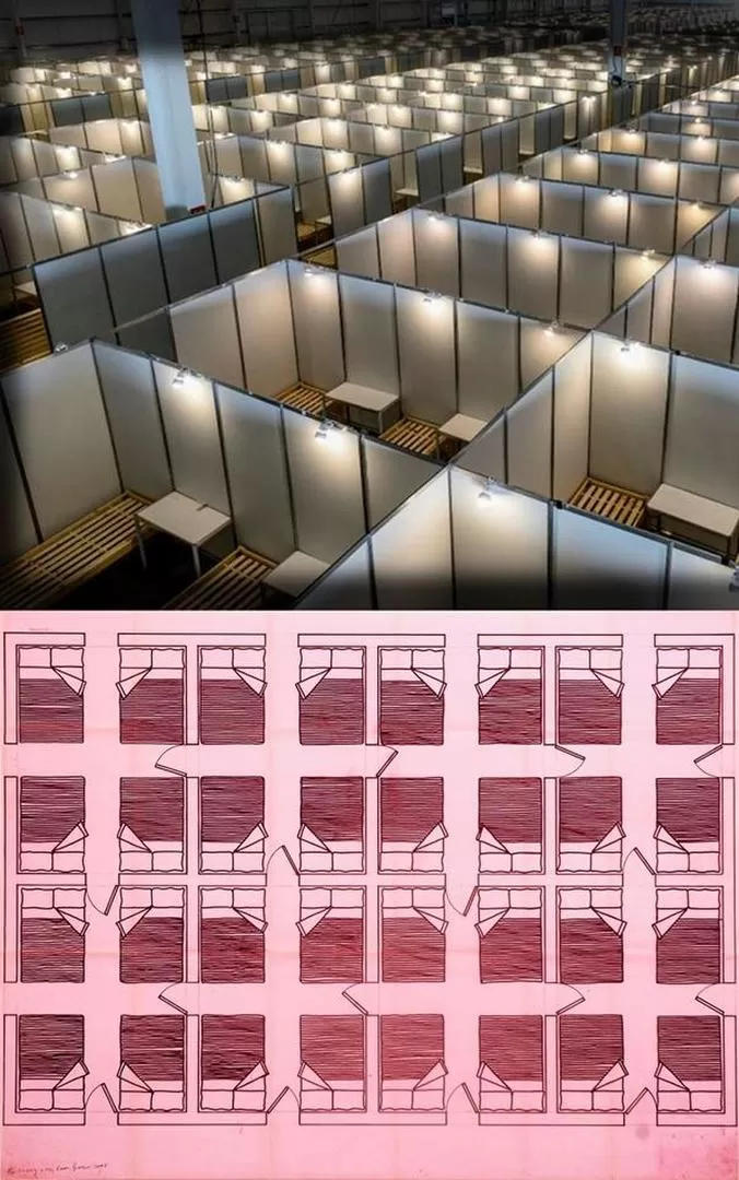 Otra de las imágenes subidas por el MUNT ensambla una heliografía de León Ferrari (de patrimonio propio) con una fotografía publicada en un diario del centro sanitario montando en Tecnópolis con una serie de camas. La heliografía sugiere un sinfín de camitas acomodadss, tratadas como un plano áereo. “Este ejercicio hace que la obra tenga una referencia directa a la situación que domina la vida pública y privada de esos días”, afirman Epstein y Darío Albornoz. “Descubrimos una muy buena oportunidad para repensar esas obras del patrimonio con la mirada de lo que hoy nos pasa”, añade la directora.