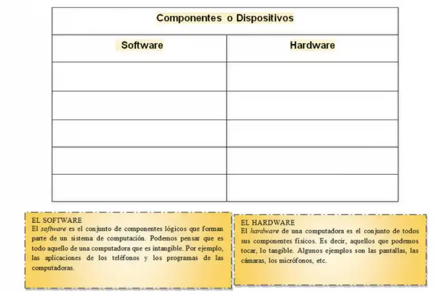 b) Completa el siguiente cuadro con los componentes, según pertenezcan al software o al hardware: