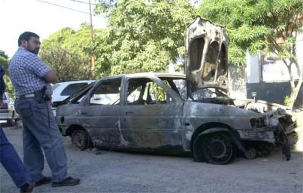 LA PRUEBA DEL DELITO. El comisario Luis Núñez observa el auto calcinado de Pereyra.