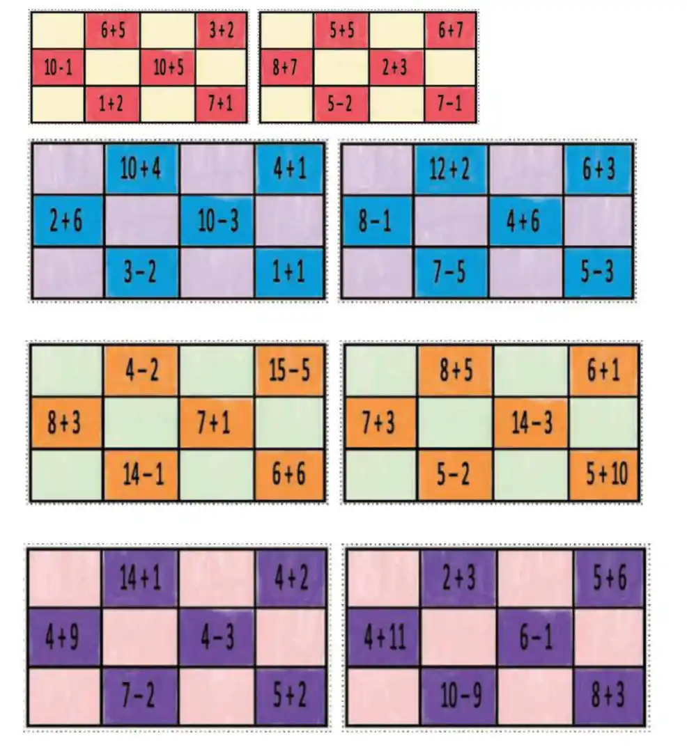 - Cartones que contienen sumas y restas que dan como resultado números entre 1 y 15 (modelos al final).