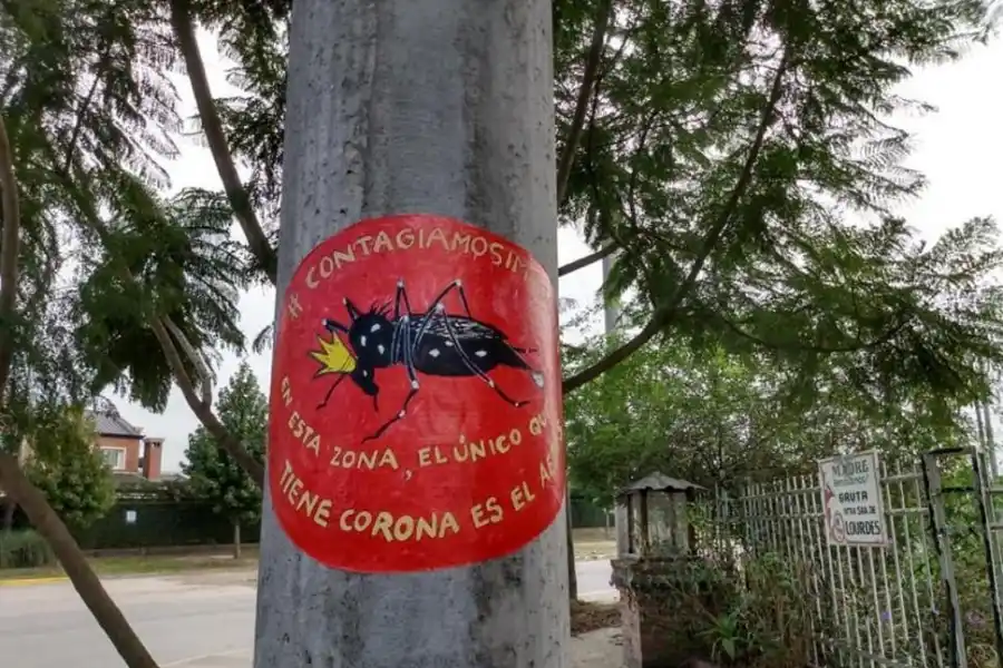 En un barrio, una imagen con el mosquito pintado de negro, se lee: “En esta zona, el único que tiene corona es el aedes”.