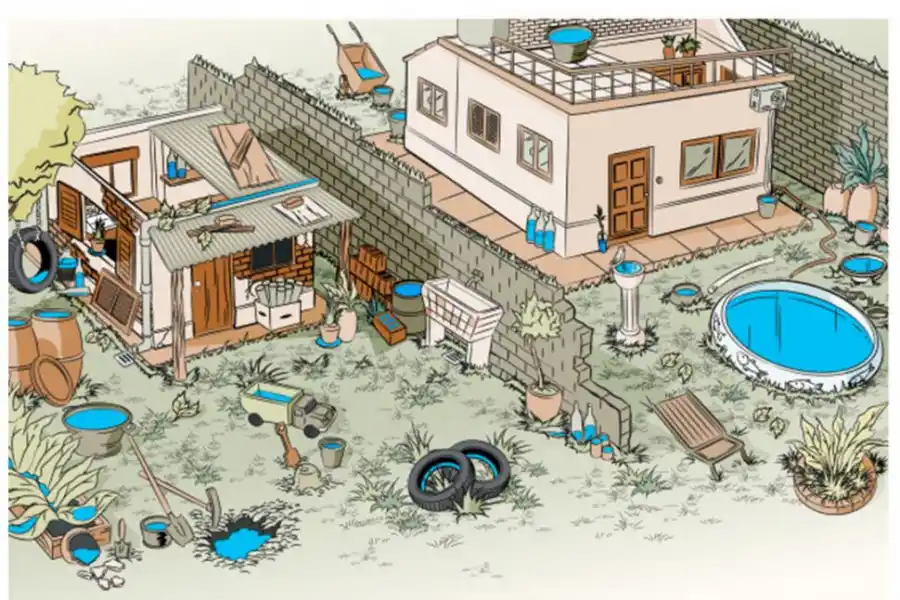 Recuerda todo lo que observaste en el video y marca en este dibujo todos los objetos que puedan acumular agua