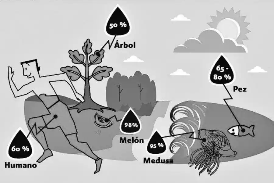Todos los seres vivos estamos formados por cierto porcentaje de agua. El agua está presente en muchos seres vivos en proporciones diversas, por ejemplo en las plantas y en los alimentos.