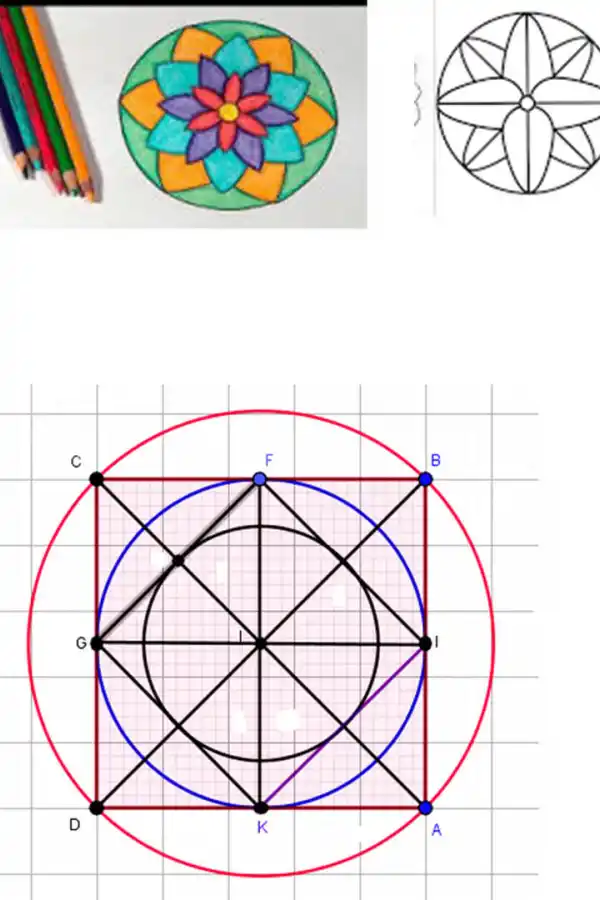 Eliana pensó en personalizar su mandala, para ello eligió regla y compás, Realizó el siguiente dibujo: