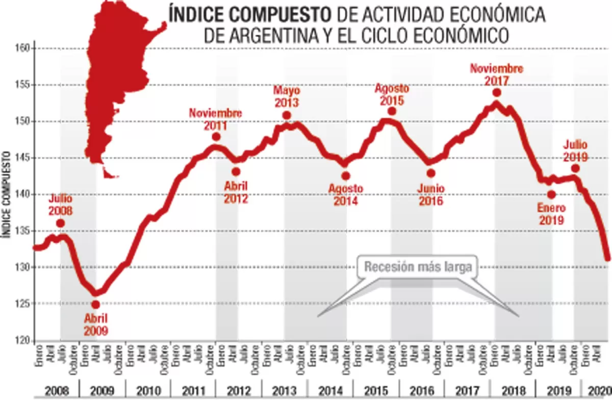 Muchas veces una imagen vale más que mil palabras. Por eso el gráfico que acompaña el texto presenta la dinámica de la economía argentina de los últimos años. Se lee así: a mayor altura de la línea roja, mayor actividad económica. Los puntos rojos nos indican el mes en que el ciclo de la economía cambia de sentido; se acaba una expansión y comienza una recesión, o viceversa. Las sombras grises, en el fondo, marcan el tiempo en que la economía argentina está en recesión. Se hace énfasis en el último ciclo que se observa, que se indica con un punto en enero de 2019 como comienzo de una expansión que termina en julio de 2019. El criterio establecido en la práctica económica es que para poder determinar un ciclo, este debe durar al menos 18 meses en total, con seis meses mínimamente en cada etapa (recesión y expansión). Entonces, el proceso mecánico de los datos marca que ese es un ciclo completo de la economía. Sin embargo, el control humano nos obliga luego a eliminarlo. A la luz de la historia no se conformó un ciclo, sino que fue más bien un descanso en una escalera hacia abajo.