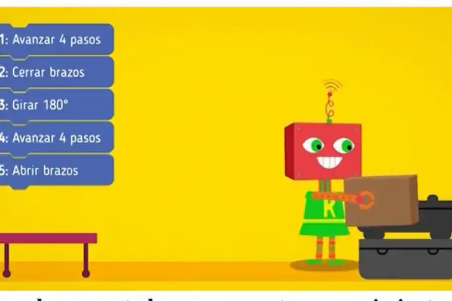 Los chicos del video escribieron en la computadora unos bloques con los pasos que debe hacer la robot para llevar la caja desde la mesa hacia la valija que está en el piso.