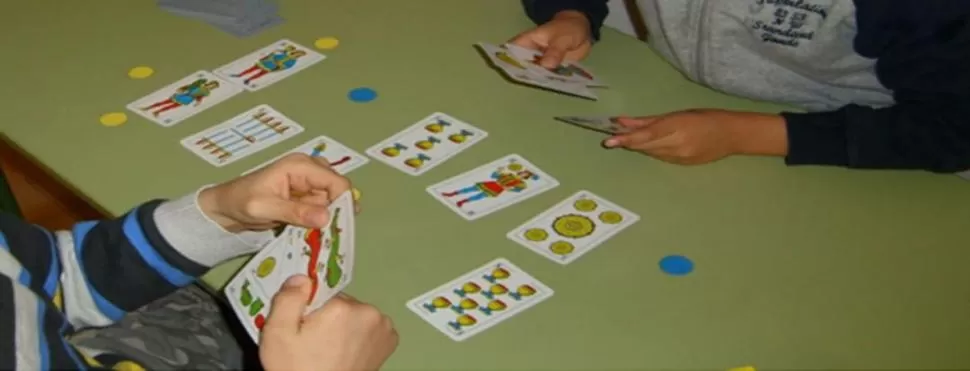 - Un jugador reparte tres cartas a cada uno de los participantes y coloca cuatro naipes boca arriba en el centro de la mesa.