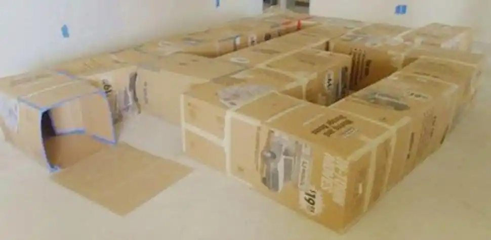 - Utilizar cajas de cartón, sacarles el fondo para que el niño pueda entrar, salir, arrastrarse y desplazarse por las cajas. También, podemos ofrecerles distintos materiales: témperas, felpas, crayones, para que intervengan las cajas realizando gráficos o pintándolas.