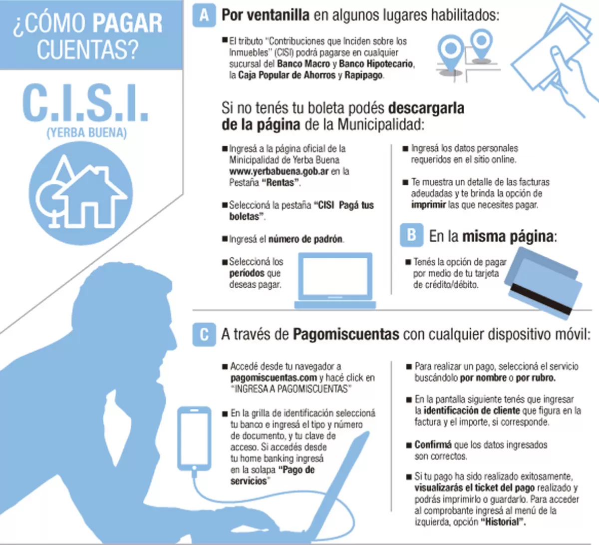 Existen varios métodos para pagar los impuestos y servicios que no requieren abandonar el hogar y resultan útiles en estos días de pandemia. Está claro que la mejor manera de evitar el contagio y cuidar la salud es quedarse en casa. Así, este instructivo pretende ayudar a los tucumanos que aún acostumbran ir a locales de cobro de servicios a cumplir con las obligaciones a que lo hagan sin salir de la comodidad y de la seguridad de sus casas. Como muestra la infografía, el CISI (contribución que incide sobre inmuebles) de la ciudad de Yerba Buena puede saldarse de distintos modos: se lo puede hacer en la página Municipalidad, mediante Pago mis Cuentas y mediante el sistema de home banking.