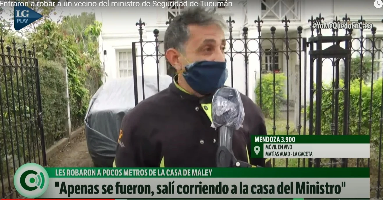 El comerciante Daniel Gutiérrez denunció haber sufrido un violento asalto esta mañana en su casa, ubicada en calle Mendoza al 3.900, donde reside junto a su familia. "No se puede creer que esto haya pasado a la par de donde vive el ministro de Seguridad (Claudio Maley). Si esto sucede acá, cómo será en los lugares donde hay menos protección policial", relató al víctima a LA GACETA Central, que se emite por LG Play.
