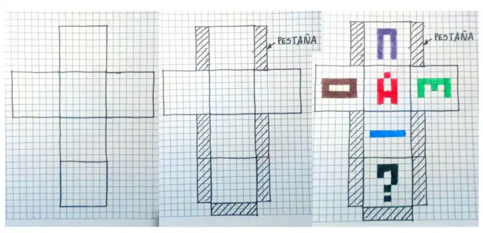 3) Ahora con diferentes colores agregaremos las vocales, una en cada lado, y un signo de pregunta en el lado restante.