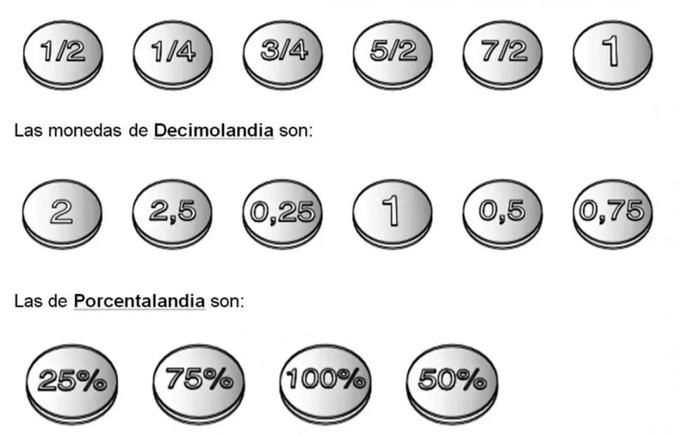 En Numerolandia hay tres tipos de monedas: la de los habitantes de Fracciolandia, la de los habitantes de Decimolandia y las de Porcentalandia.