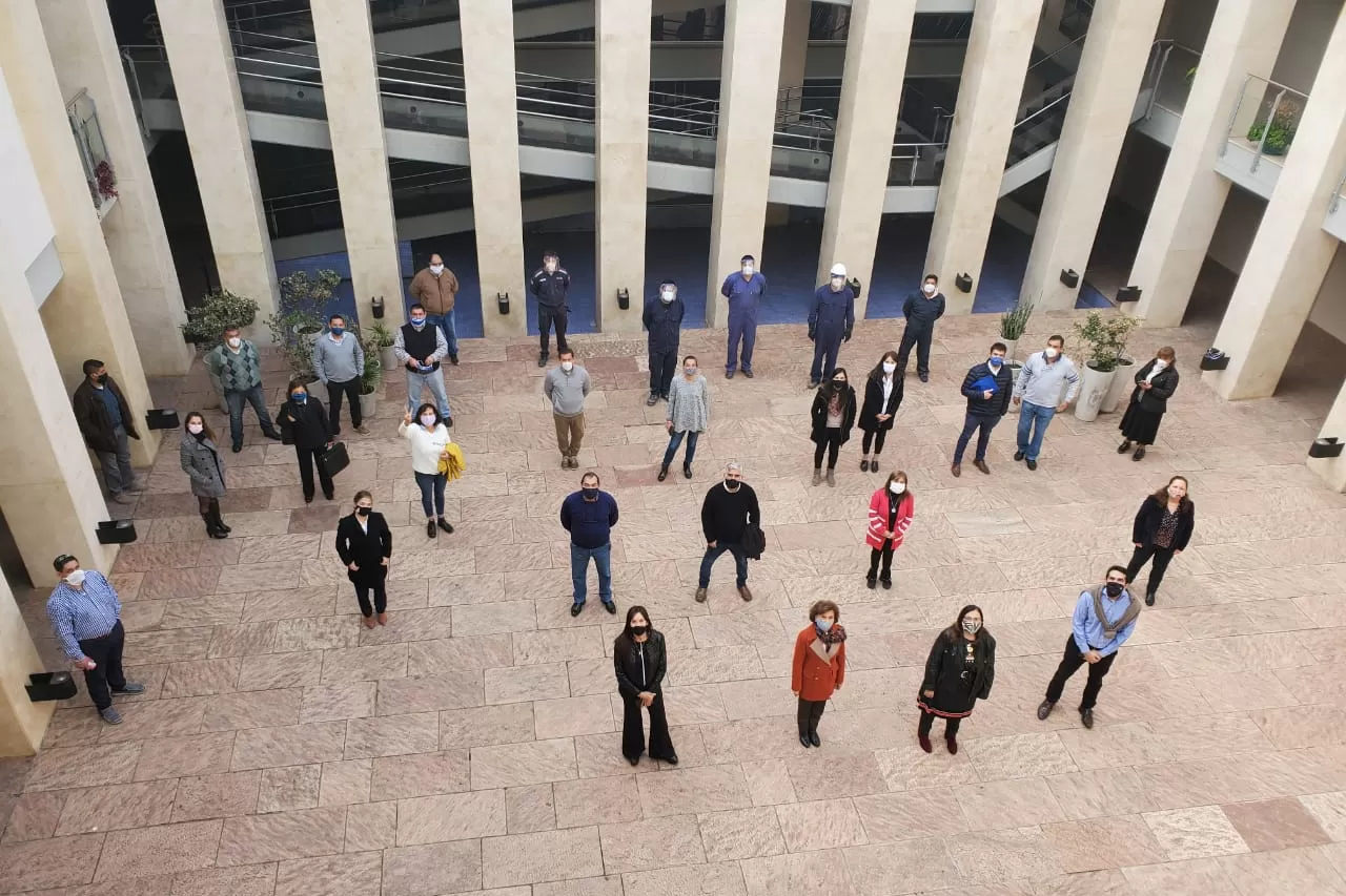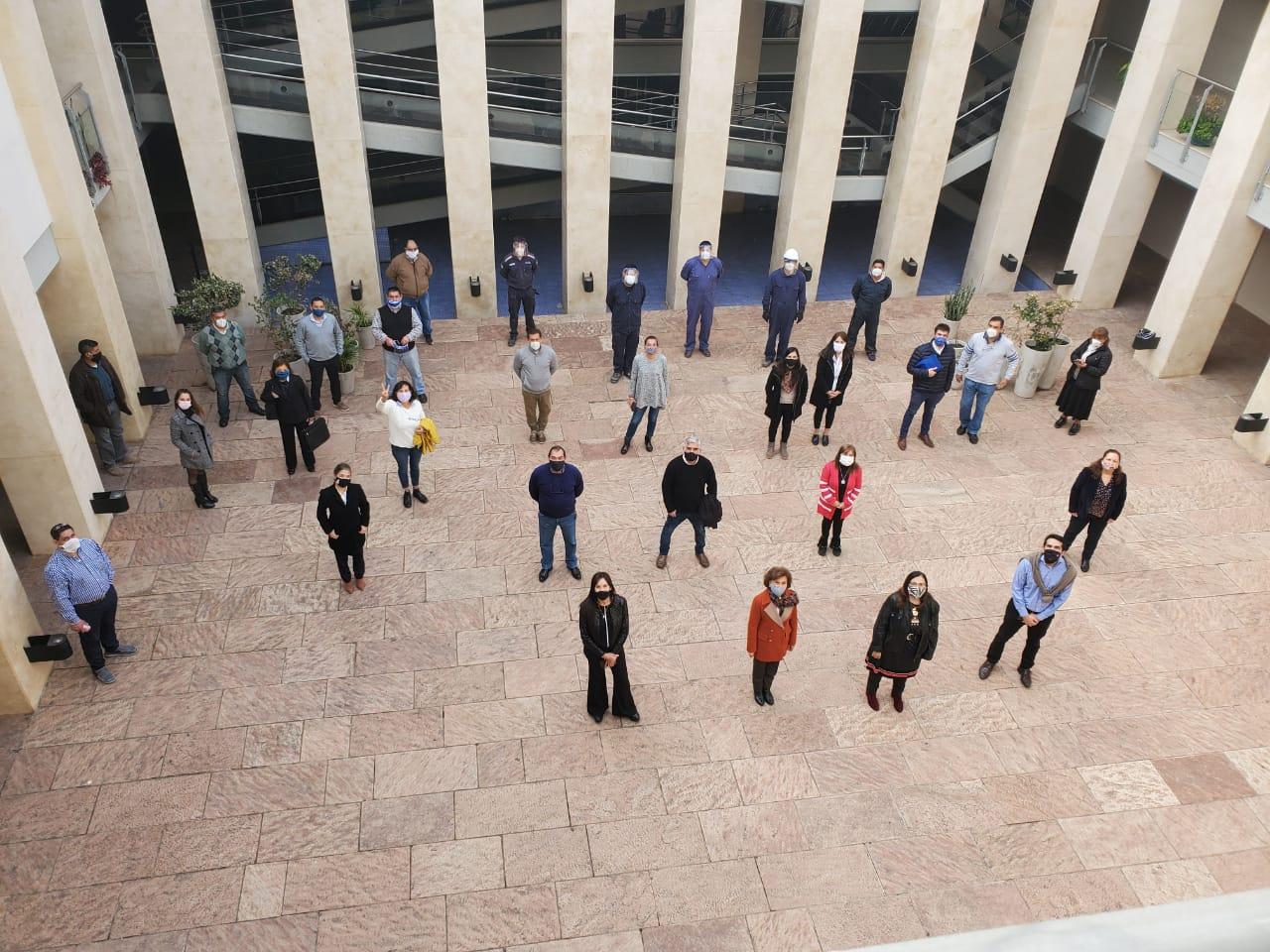 La primera actividad de la jornada fue una reunión de la decana y la vicedecana Marta Tejerizo, acompañada por el gabinete, con todo el personal en el patio de la Facultad. La charla, en la que se guardó una distancia preventiva, fue para transmitir que el regreso también debe ser para un cuidado mutuo.